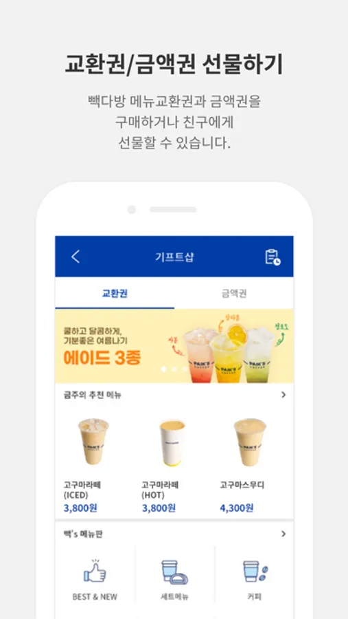 - 기프트샵 : 모바일쿠폰과 금액권을 구매하거나 선물할 수 있습니다.