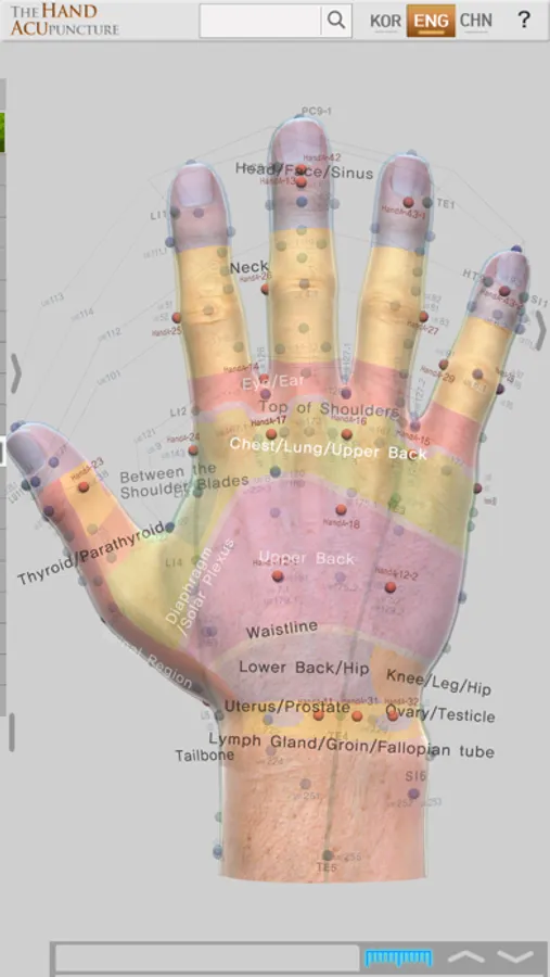 This App contains 21 acupoints in the Hand back part and another 21 acupoints in the Hand palm part, and each acupoints is written in Korean, English and Chinese texts in terms of location, efficacy and operation method.