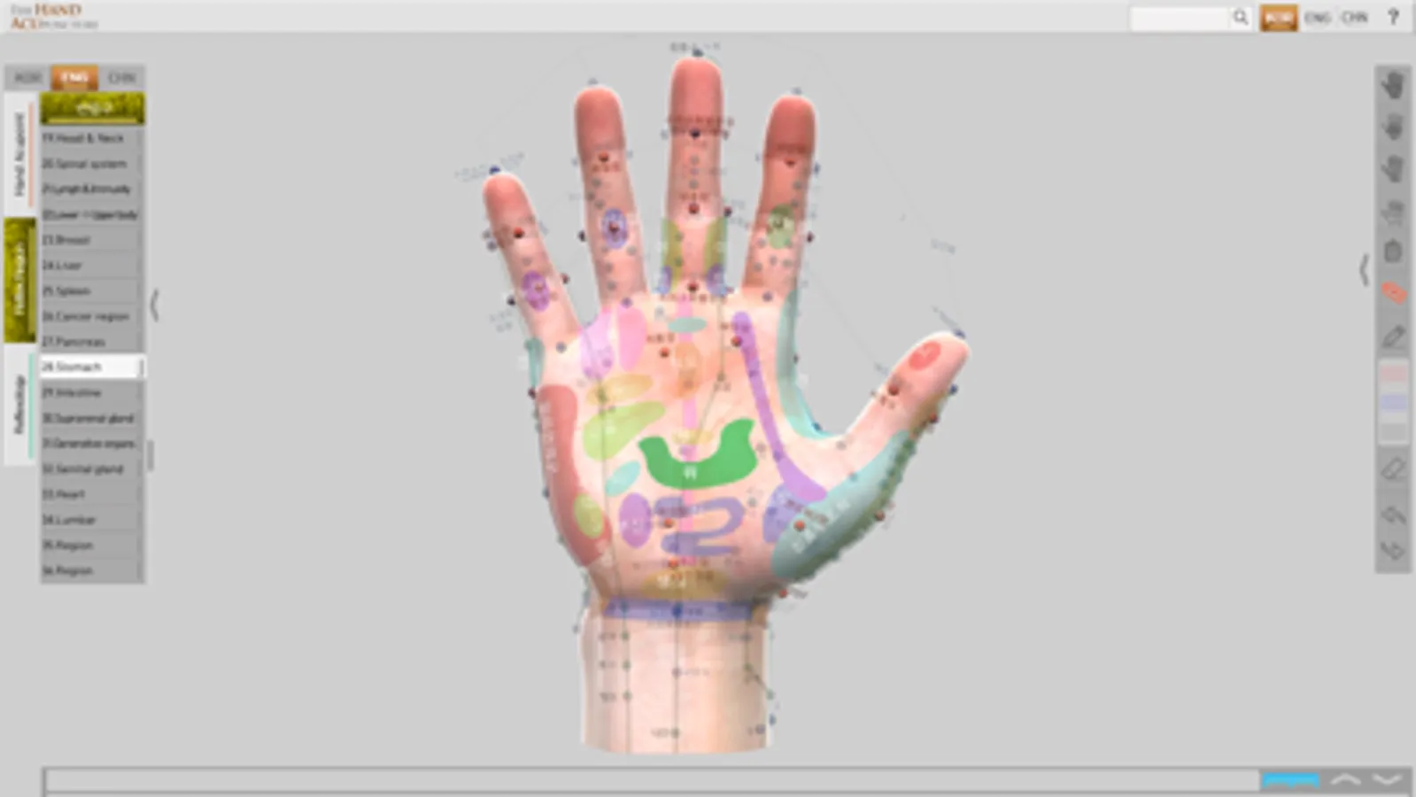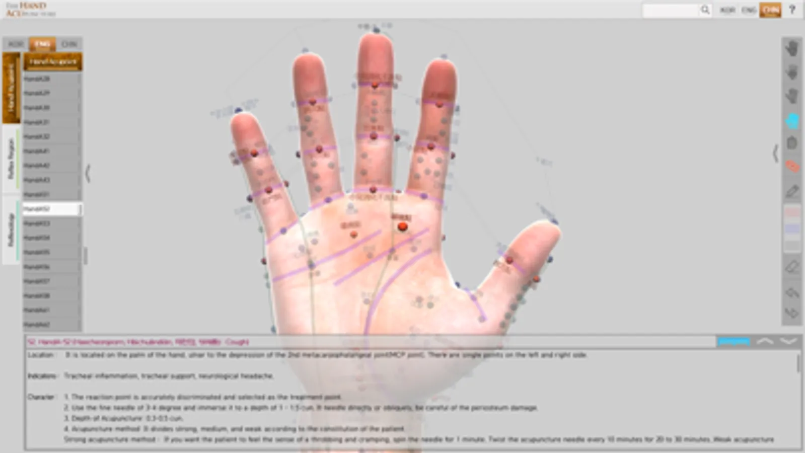 The reflex region which was used as the basis of the diagnosis in the traditional Hand Acupuncture therapy is also arranged in 3D. The Reflexoloy chart used as a basis for other forms of diagnosis and treatment are also arranged in 3D. You can compare The reflex region of a traditional form with The Reflexoloy chart of other theories in 3D, and you can also compare The Hand Acupoints in 3D.