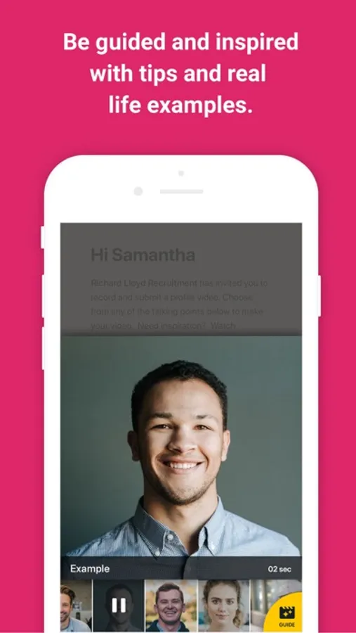 Introducing will guide you through the simple process of creating a short profile video. Take your lead from personalised suggested talking points provided by your recruitment consultant. Check out the handy tips and real-life example videos at any time for some inspiration.