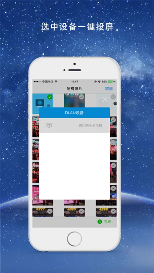将手机相册中的照片或视频投屏到支持DLAN的电视,机顶盒等屏幕上面,可以共享给更多的人观看;在办公开会,家庭亲子互动等特殊环境效果更好.