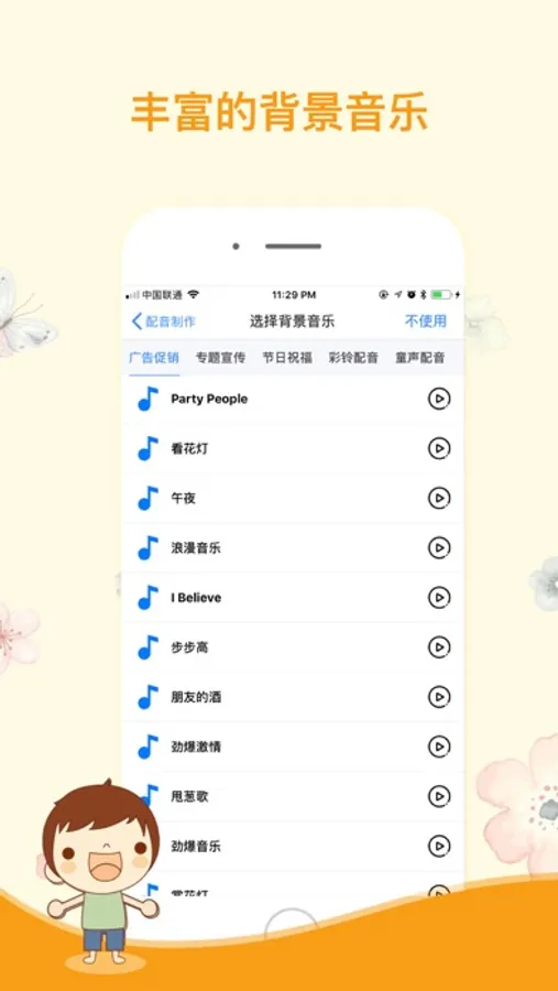 3.海量的背景音乐和文本模版供您选择,更有本地音乐上传功能;