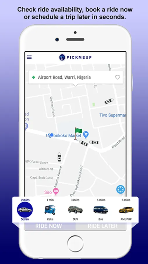 Pickmeup offers the easiest and fastest transport booking service for Cars, SUV, Minivan, Bike and Keke. It is designed to improve safety by allowing a passenger to view the driver's name, photograph, reviews as well as vehicle information in advance before the driver arrives.