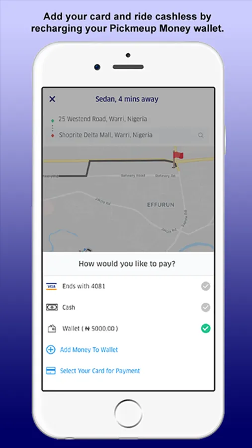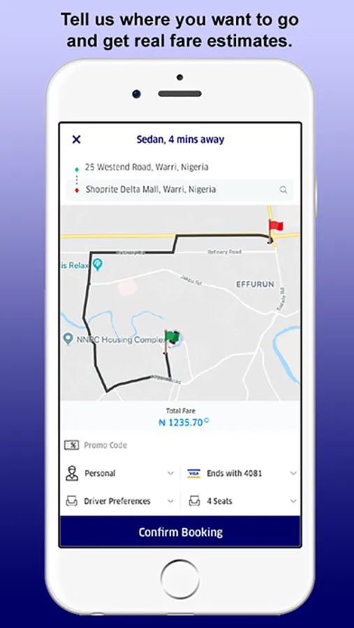 2. Start Booking! The app will automatically detect your location for pickup. Choose your preferred Ride – Sedan, Business, SUV, Keke or Minivan.