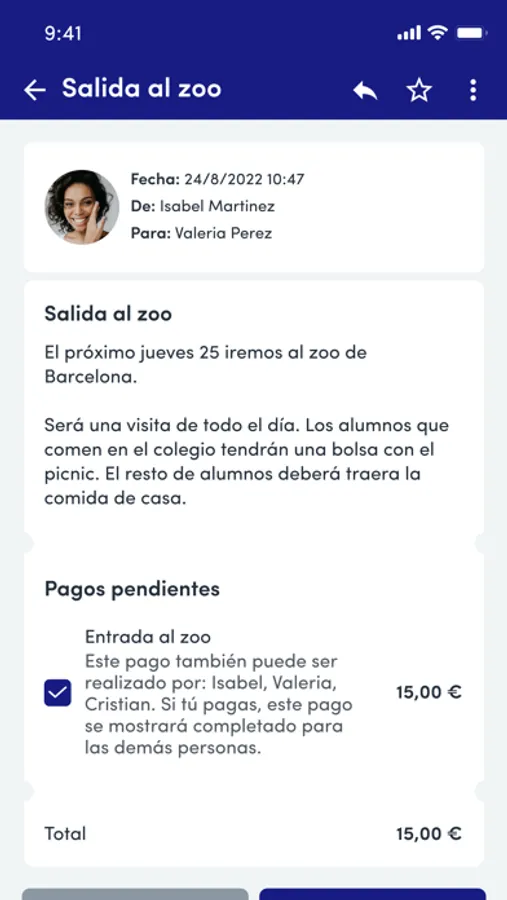 Los mensajes pueden ser en múltiples idiomas, y pueden contener archivos adjuntos (PDFs, fotos, videos, informes, notificaciones de ausencias o retrasos, etc). Mediante un sistema de comunicación privado y seguro entre escuela y usuarios, estarás al corriente de la evolución diaria de las clases.