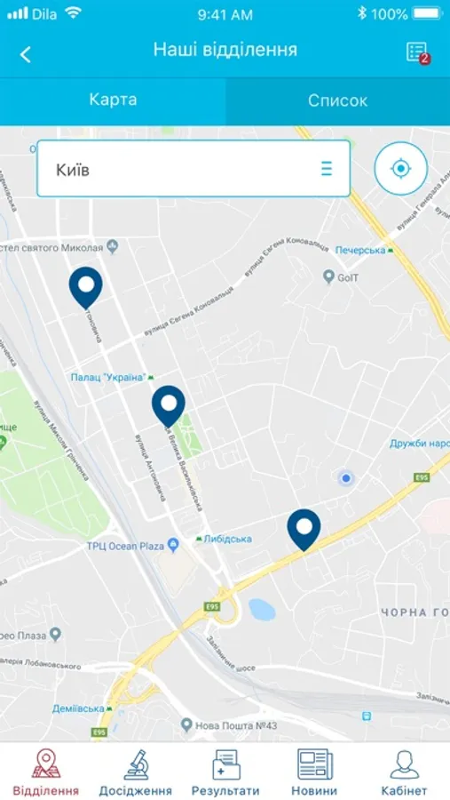 ∙ знайти найближче відділення МЛ ДІЛА і прокласти зручний маршрут до нього;