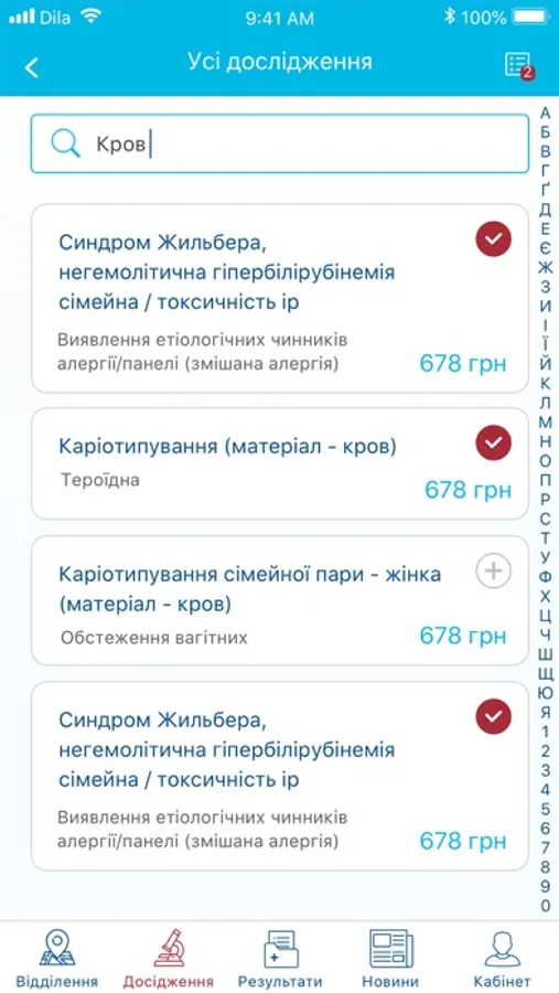 ∙ обрати кілька необхідних досліджень і сформувати кошик, щоб дізнатися повну вартість переліку.
