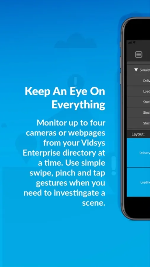 Swipe through your view of the Vidsys Directory to select and display up to 4 cameras and/or webpages at a time. Switch a single camera into full screen view when you want to take a closer look. When you’re finished, return to split screen view with a single tap.