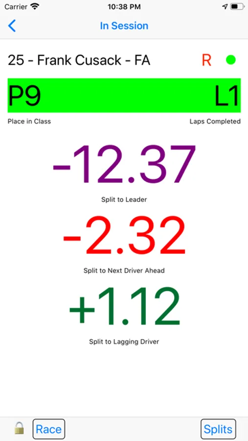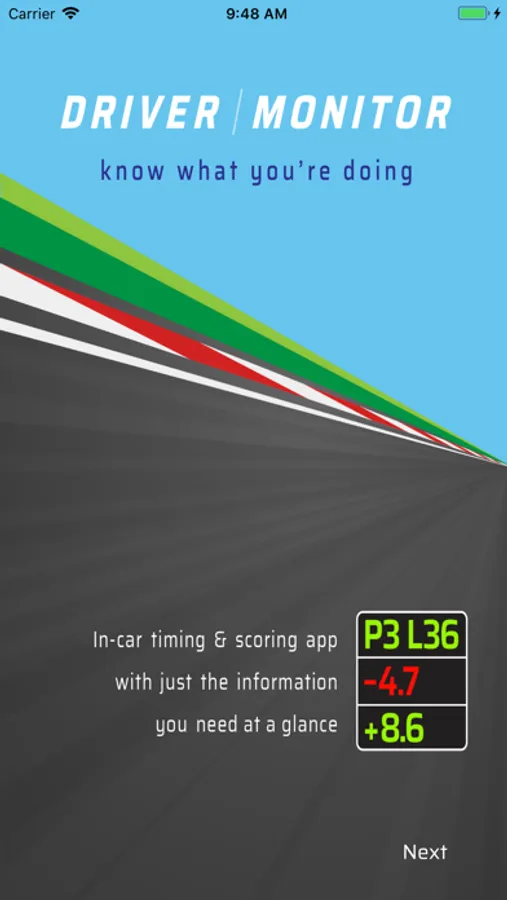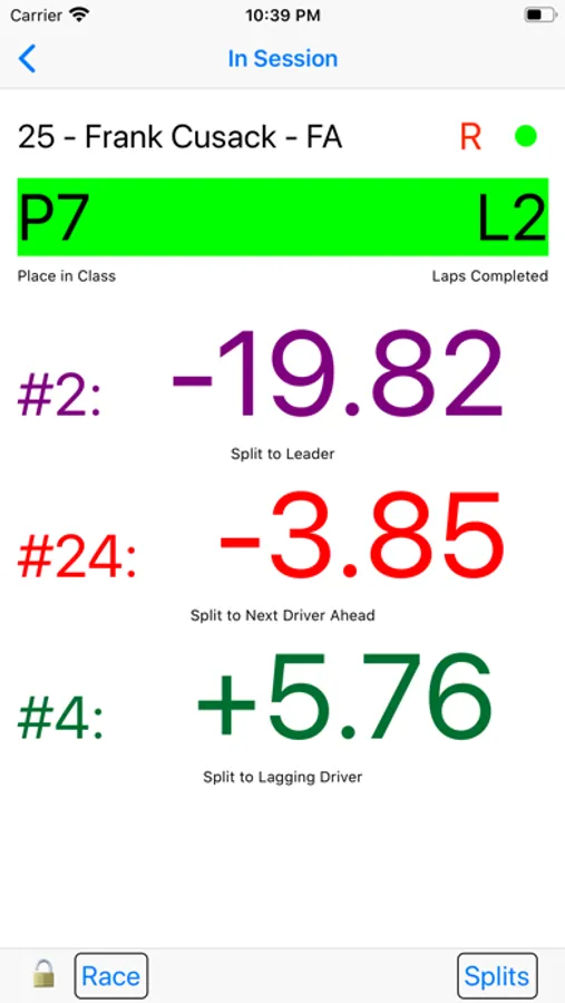 DriverMonitor is the in-car glanceable live timing and scoring display for motorsports. Quickly determine your position in the race, the time or laps elapsed or completed and your split times to or lap times of the class leader and the cars in your class immediately in front and behind you. DriverMonitor displays just the information needed related to your position in the race in a quickly glanceable display to allow you to compete with all the live scoring details of the race in-car with you during the event.