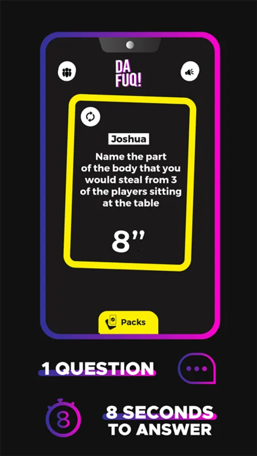 The concept of each in-app card prompt is simple. Each player gets up to 8 seconds to answer a raunchy question or complete a provocative challenge. Examples: