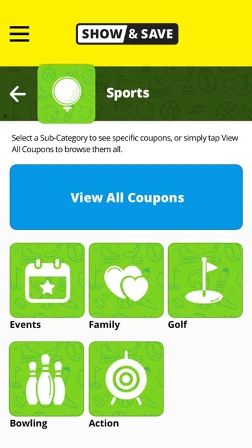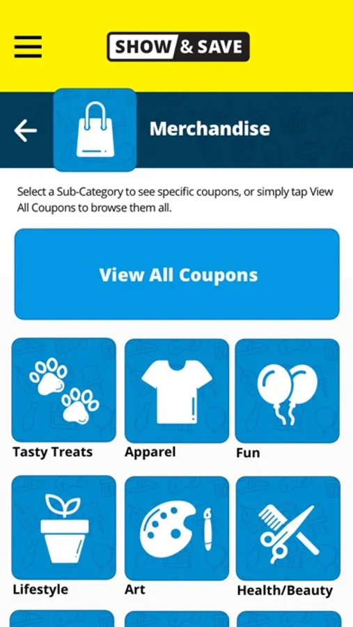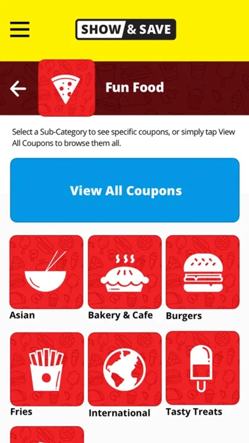 - Browse through the categorized coupons.