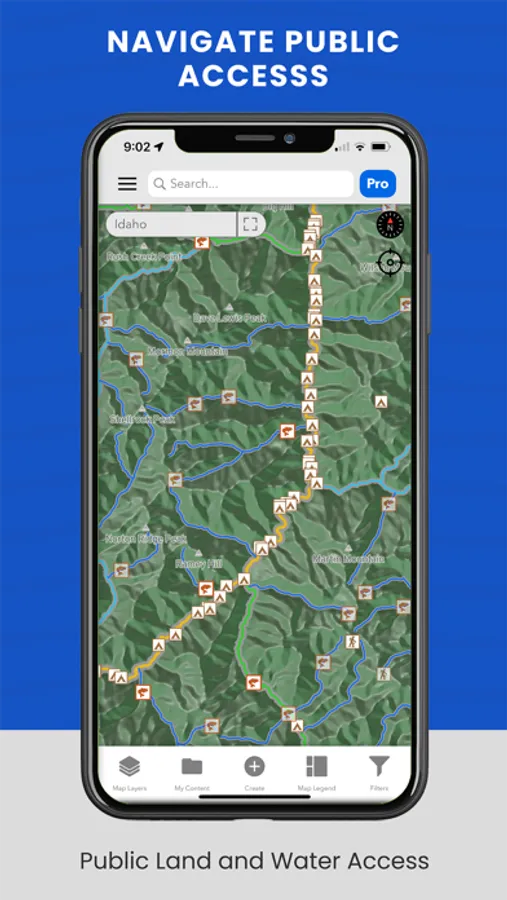 • ACCESS: Public and non-public land and access points, trails, easements, wildlife management areas, and parking spots