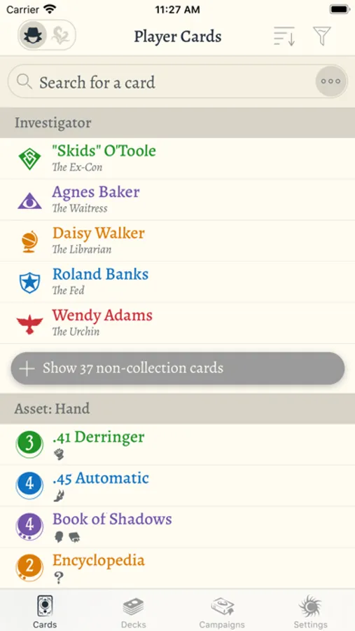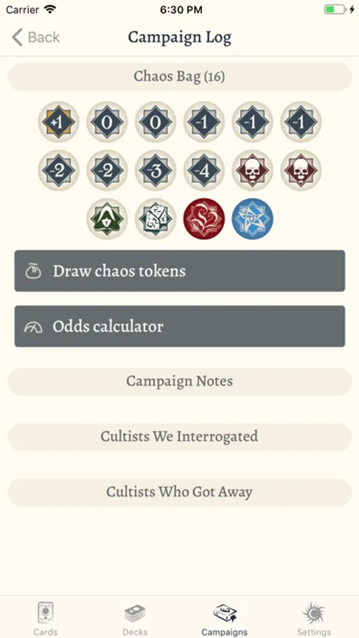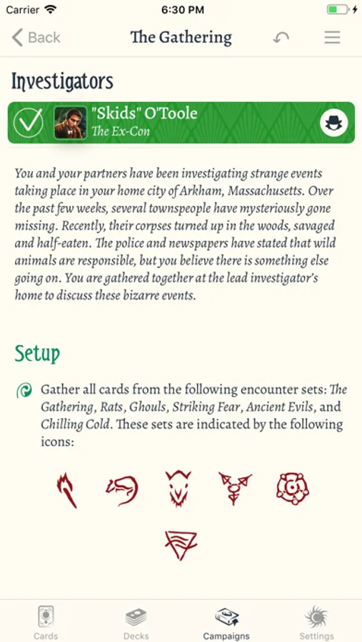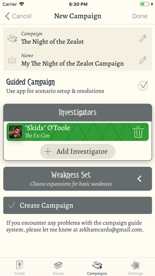 Create and edit decks for all of your investigators -- it will even check the deck-building rules to keep you honest. You can also group together decks into campaigns to track your progress combatting evils. The app can be used with local decks, or you can link your ArkhamDB account to sync changes on the go.