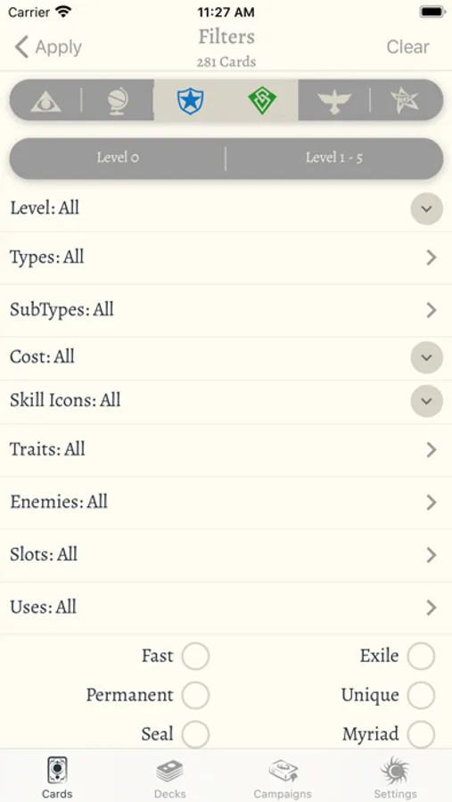 • Use the advanced card search to search by trait, health, shroud etc. A great tool if you ever need to evaluate how many 'non-elite' enemies can be targeted by a card or know which locations a Flashlight wielding Zoey can actually stand a chance at investigating.