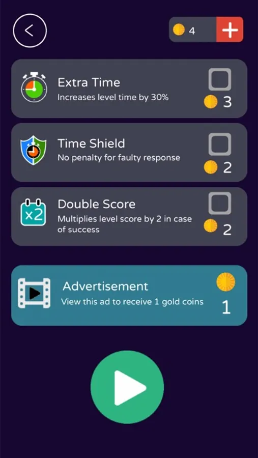 For every level completed you'll receive a coin which you can use to buy helpful power ups like bonus time, a penalty shield or a score multiplier. Track your performance on the statistics screen and try improve your mind further and further.
