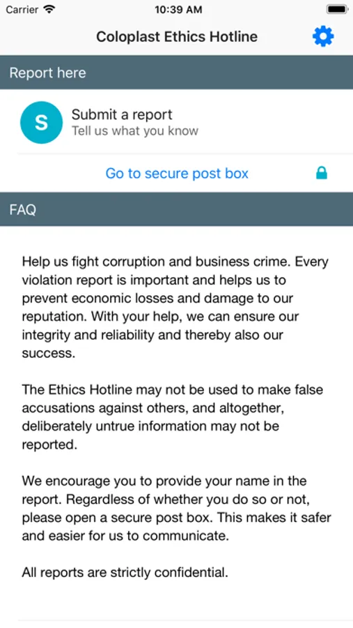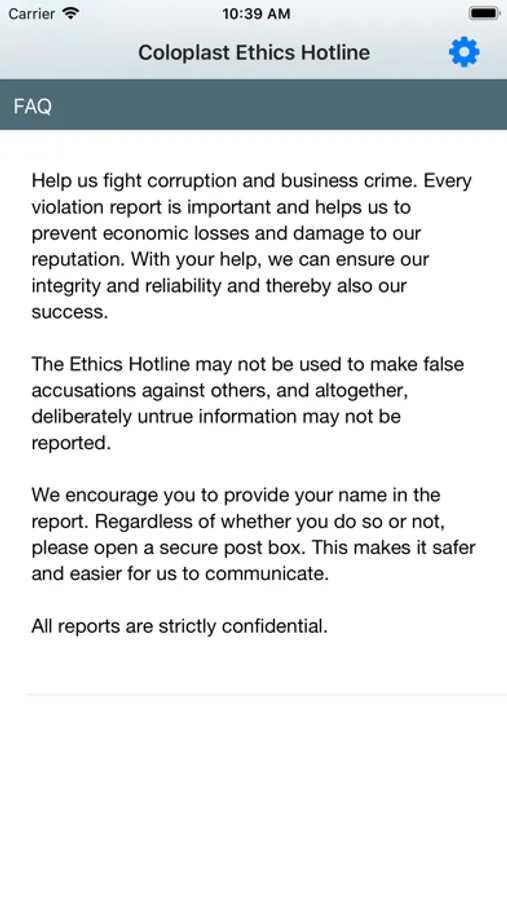 This app will allow you to raise concerns on misconducts (including alleged misconducts) to Coloplast Ethics Hotline. The reports will be handled by the Coloplast Hotline Group with utmost confidentiality.