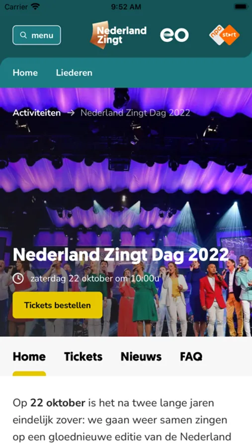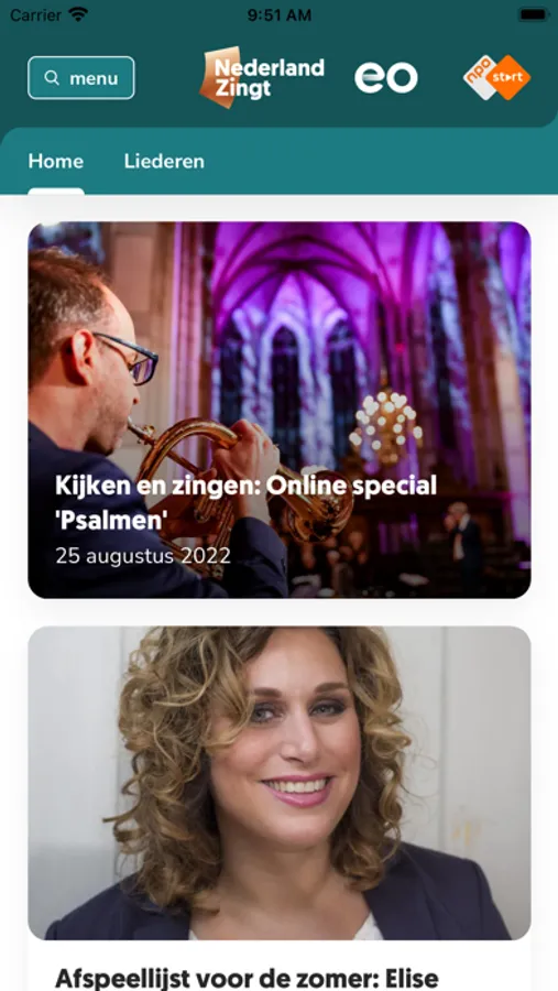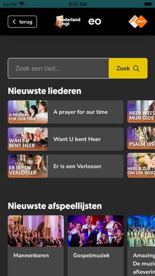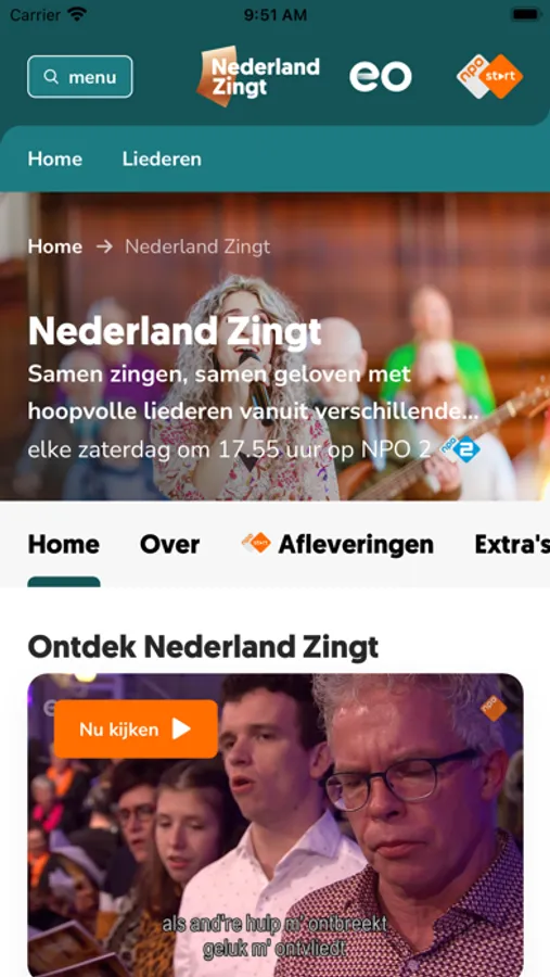 Nederland Zingt bekijken waar en wanneer je maar wilt? Het kan met de Nederland Zingt-app. Natuurlijk vind je hier ook al jouw favoriete liederen en hebben wij fijne afspeellijsten voor elk gewenst moment gemaakt. Kies bijvoorbeeld voor de lijst met bemoedigende liederen. Klinkt dit als muziek in je oren? Mooi, want er is nog meer om te ontdekken.