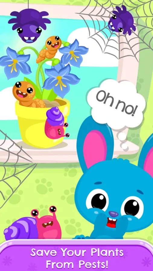 First of all, put a flower pot near the window (plants love the sun!) and decorate it with adorable stickers! Add soil and place a seed (it’s so cute!)! Water it well and watch a surprise plant grow! It can be a flower or even a cactus! The magic of nature! Oh no, there are bugs, worms and snails on your flower! They look super cute, but they can eat you baby plant! Save it from pests! Now spray your plant with water and help flowers blossom by tapping on them! Good job, little gardener! Enjoy your own mini jungle!