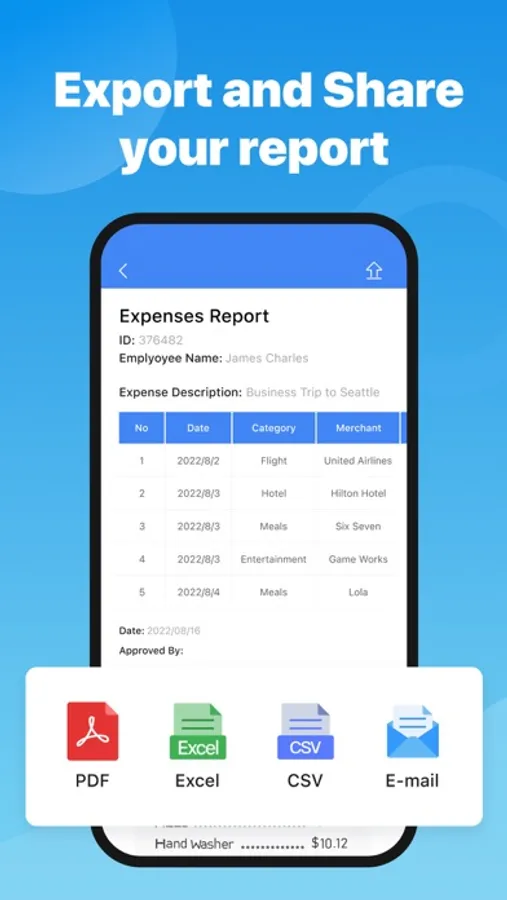 Can share your expense report to your company for reimbursement or to friends for shared expenses