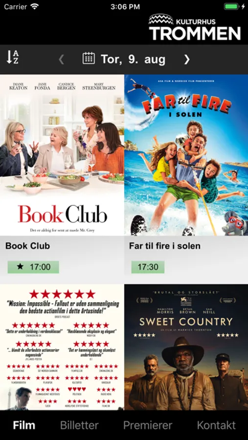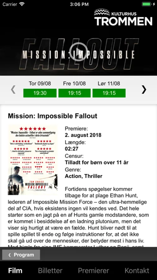 Med denne app har du mulighed for at gennemse programmet for Trommen, samt se yderligere filminformationer som trailer, censur, medvirkende skuespillere, varighed m.m.
