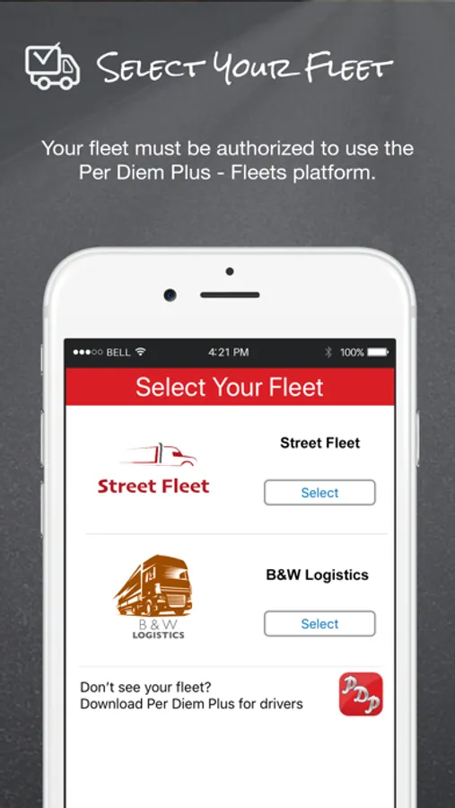 Per Diem Plus® - Fleets is a free mobile app that automatically records IRS’ special trucker per diem for travel within the USA and Canada for solo and team OTR truck drivers. Your fleet must be authorized to use the Per Diem Plus - Fleets platform in order to access the app. To register, it's the same process as Per Diem Plus, but you will need your fleet-assigned Driver ID. There is no subscription fee. You can use the Per Diem Plus® - Fleets app for the term of your employment with your fleet.