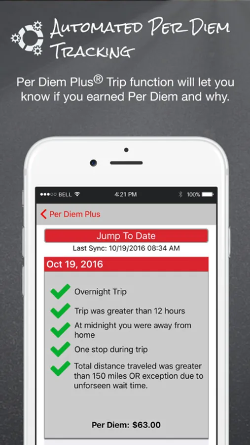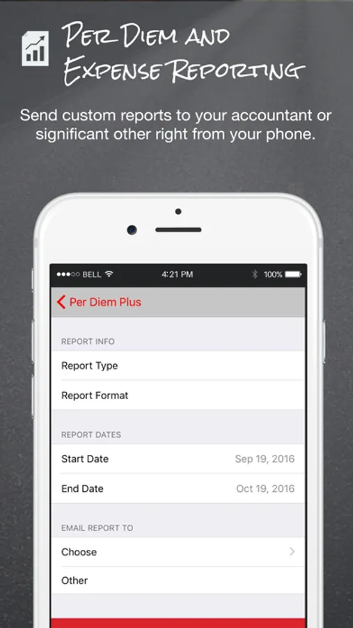 * Send detailed per diem and expense reports, including receipt images, to yourself or fleet in seconds
