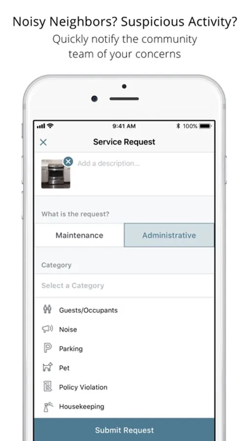 With Alexan Life App you can create a new service request and capture the details to get the issue resolved in just seconds. Have a clogged sink? Just snap a picture and send it directly to the community team.