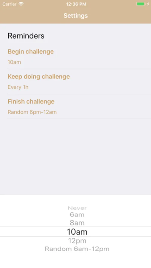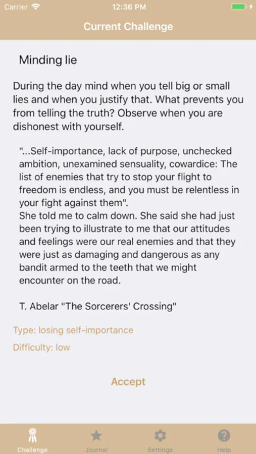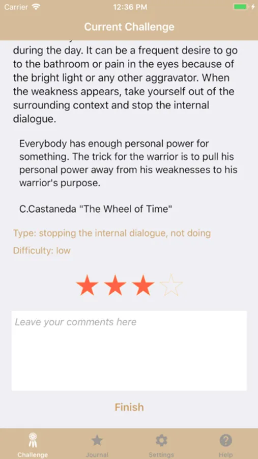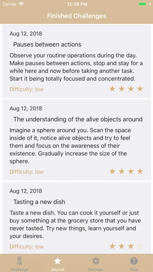 A new task is available every morning; it can be taken or skipped. The practice continues during the day and finishes at night. The finished tasks are recorded in the Journal. Every task has its own difficulty level. More difficult tasks will be given with time. You can enable reminders in the Settings which can help you in daily practice.
