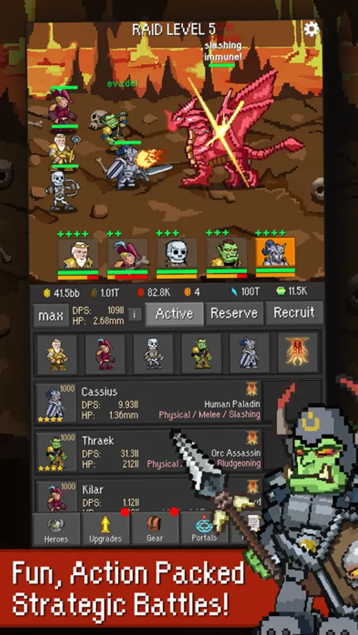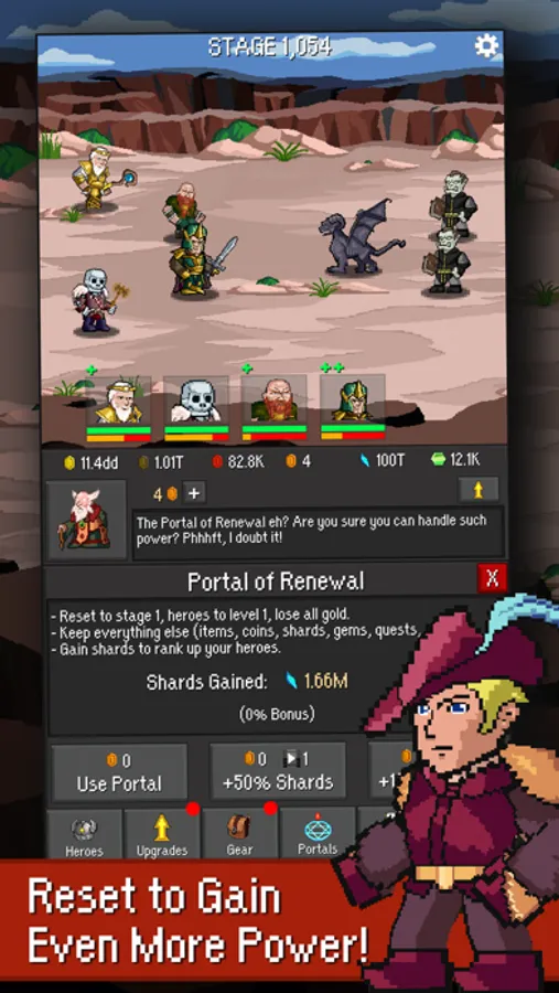 As the monsters grow stronger, earn more gold to upgrade your team and defeat them, or use the Portal of Renewal to begin again at level 1. Use the shards you gain from the portal to power up your heroes even more!