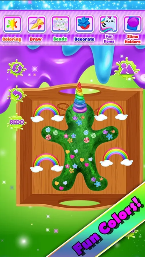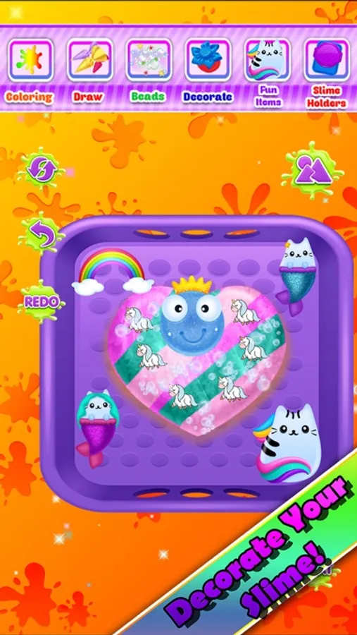 Create the best designs!! Add foam beads, glitter, decorations, fun items, unicorns, rainbows, sparkles & cool coloring! Draw & color by using your finger on your slime.