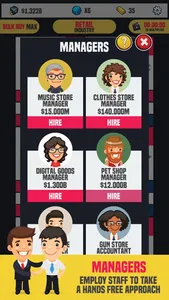 Hire experienced managers/accountants/consultants to help run your businesses while you are away from the game, invest money back into businesses to make them earn more, purchase upgrades to bring in profit boosts, dominate your industry and let the investors know you are worth investing in! Turns dollars into millions, millions into billions and billions into trillions! Your potential earnings are endless!!