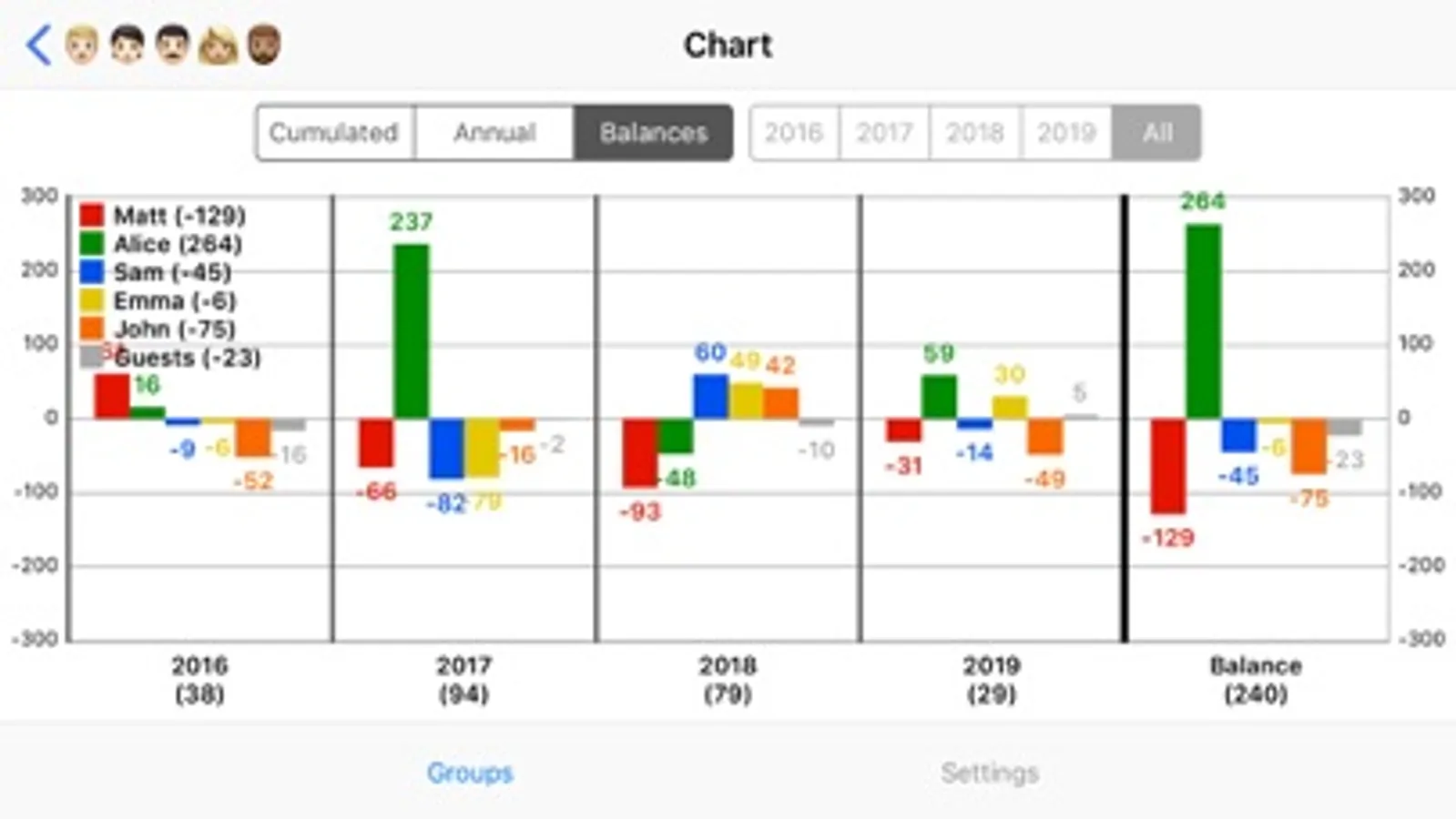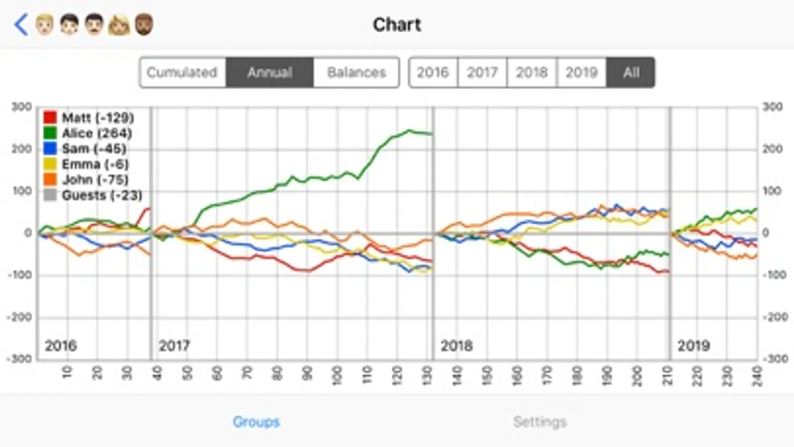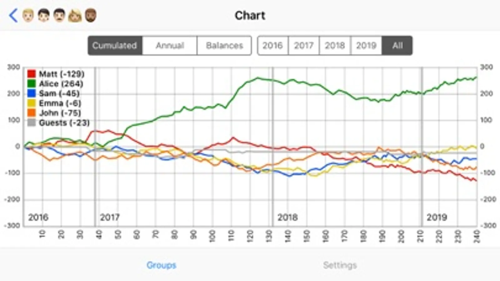 The table summarizing the parts as well as the graphs will show the BALANCES of each, calculated automatically according to the bet. For example, if the bet was 5 and the person lost, his balance will be -5. If another has won 7, his balance will be 2.