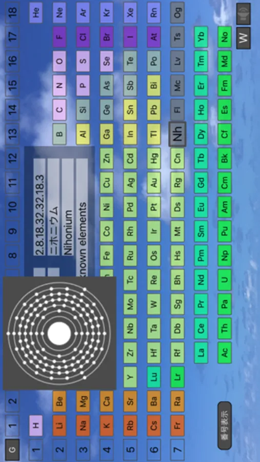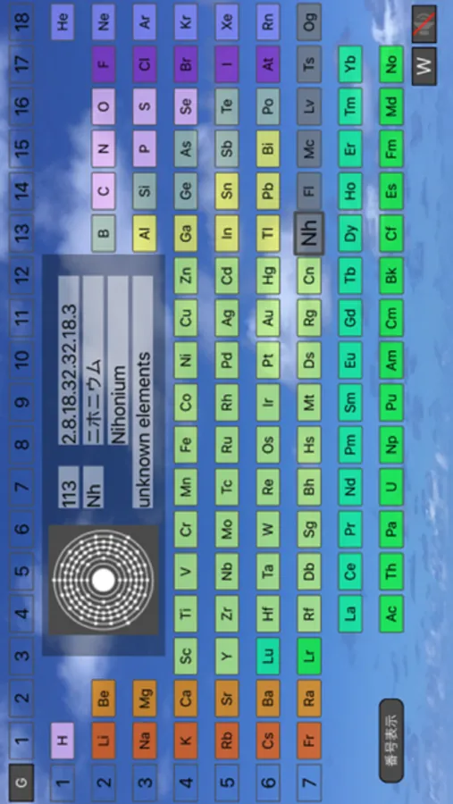 「番号表示」ボタンはタップしている間、原子番号を表示します。