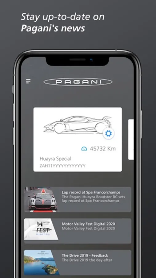 An intuitive user interface allows you to navigate quickly through the different sections of the App and provides you with easy access to exclusive events, such as the Pagani Raduno, where you will no longer need to use any other method to get in touch with all things Pagani.