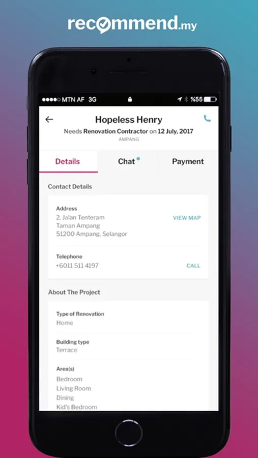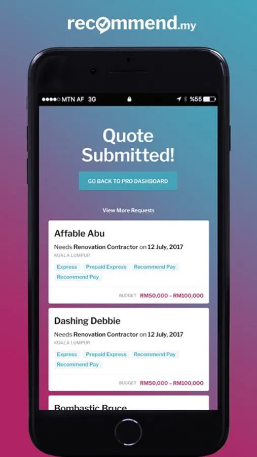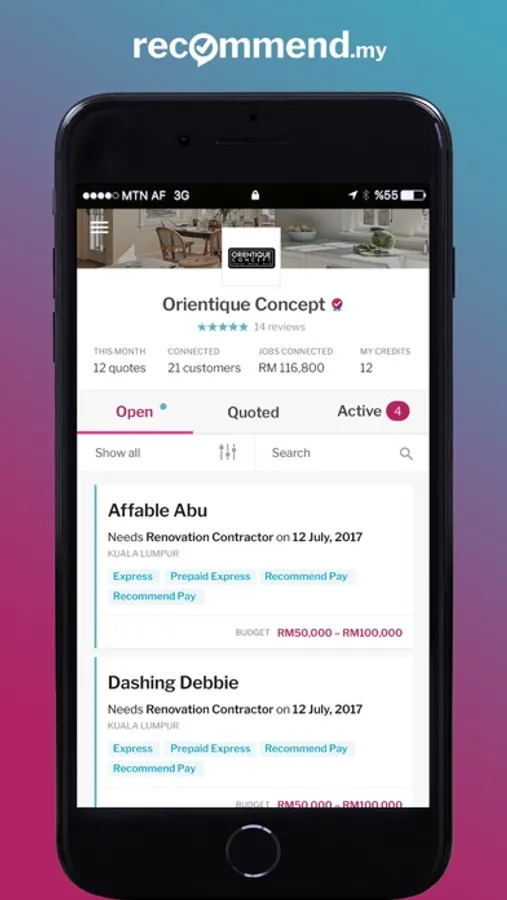 This app is for service pros in Malaysia to get more jobs and manage their work with Recommend.my.