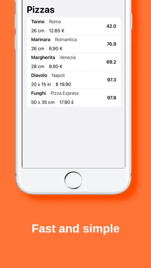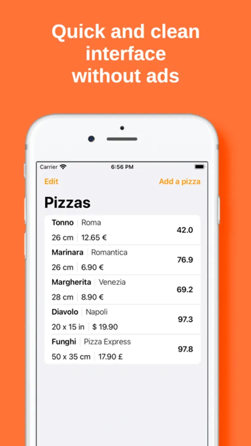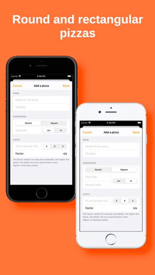You enter the name of the pizza, the name of the pizzeria, the diameter of the pizza and the price and it is calculated how much the pizza costs compared to the area.