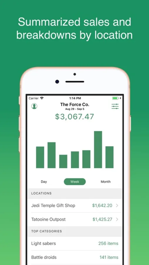 Sales reports by hour, day, week, month, year and custom date ranges. Reports show gross sales, sales tax, discounts, refunds, transaction processing fees and net sales. Sales graphs with top-selling categories per location or integration as well as an entire company and location roll-up report.