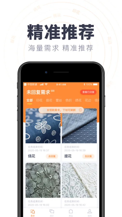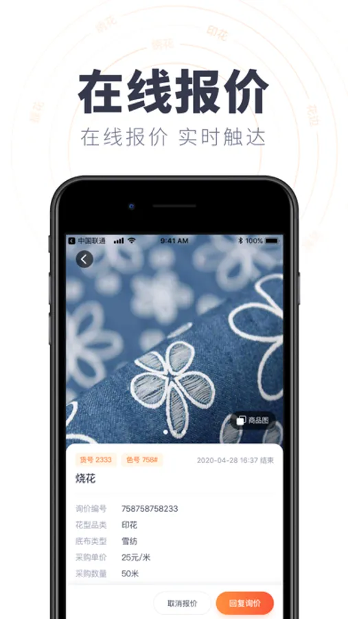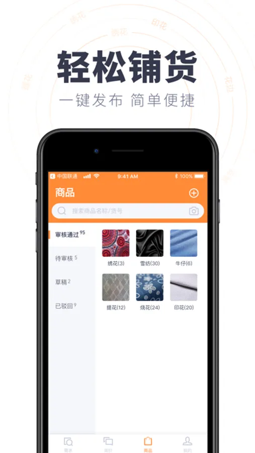 找布易(商家版)是一款专业服务于服装面料销售商的匹配app,目前已积累了全国主要交易市场商家、数以百万计的面料信息及面料图片。通过找布易(商家版)可以实时与采购客户进行找版需求回复和询价回复,同时可在线收款及处理订单。找布易有庞大的负责采购商群体每天在在线发布找版需求,通过智能图像识别技术直接触达面料供应商。赶紧加入我们,共享互联网新技术带来的业务提升。