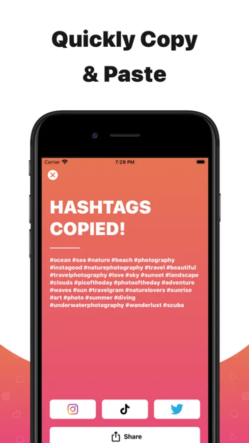 • Quick Copy & Paste - Quickly copy hashtags and navigate to any supported social media app. (Supported apps include: Instagram, TikTok, and Twitter)