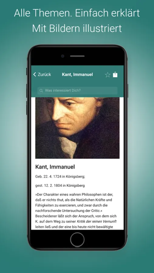 In dieser App findest Du alle wichtigen Wörter der Philosophie wieder. Einfach erklärt und mit Bildern illustriert. Mithilfe des einfachen Designs kannst Du in Sekunden