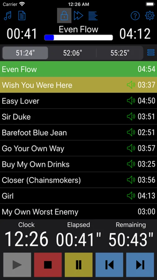 * Large progress bar and countdown timer let you know when the end of the currently playing song is coming.