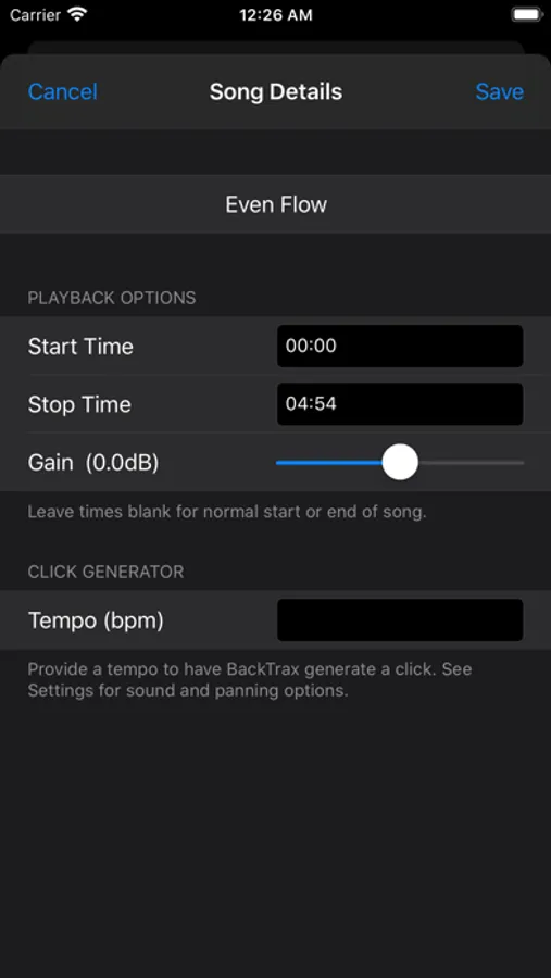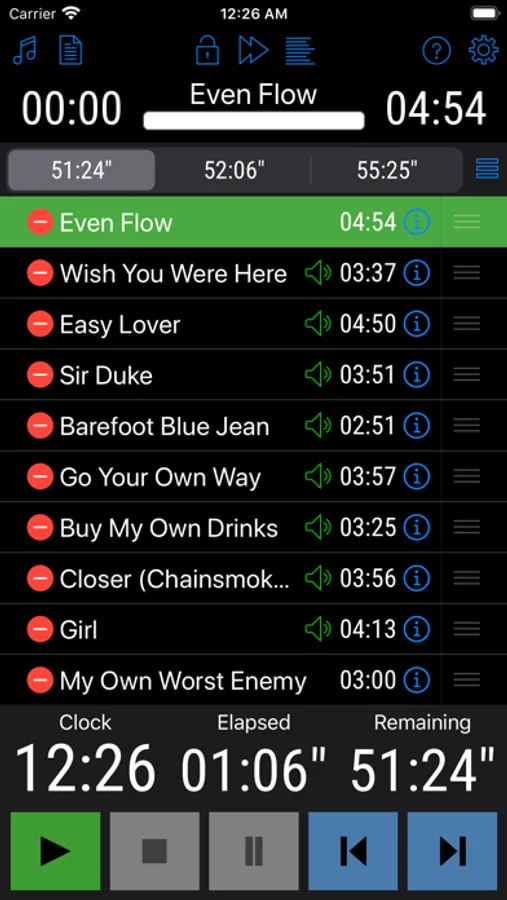 * Stops playback after every song automatically, or optionally continuously plays straight through your setlist.