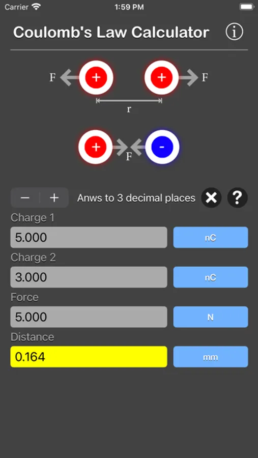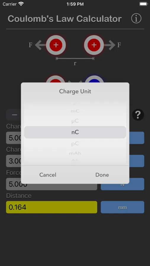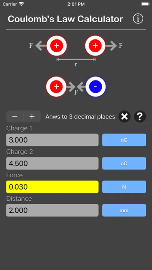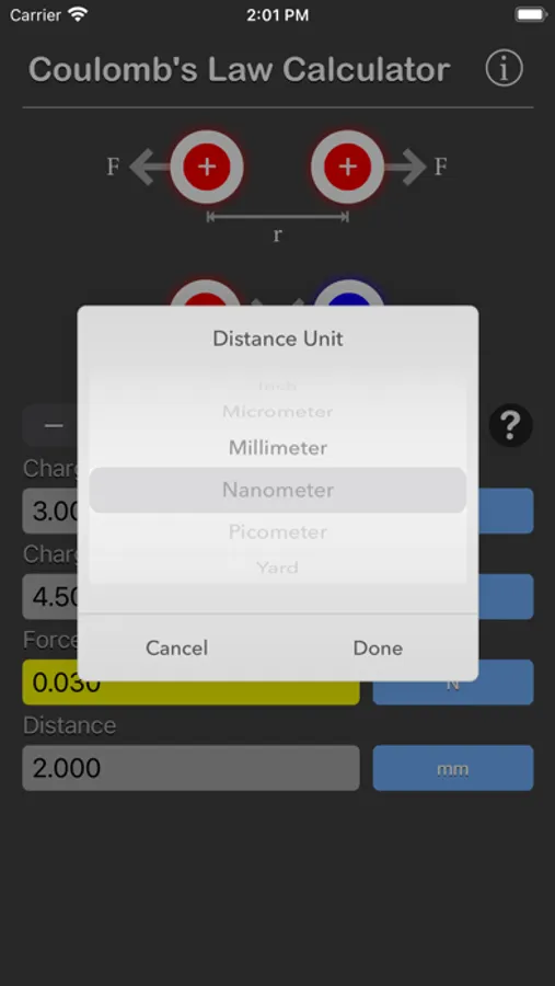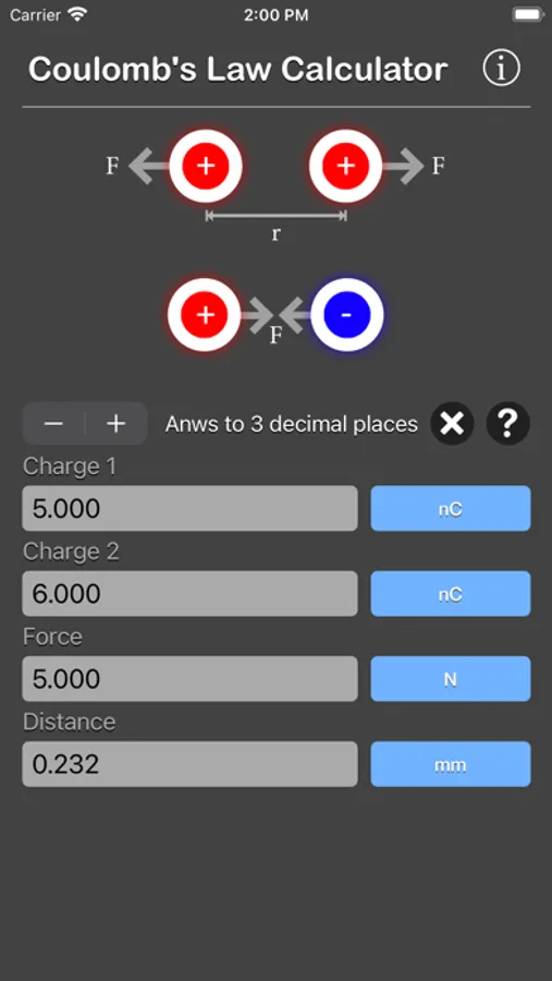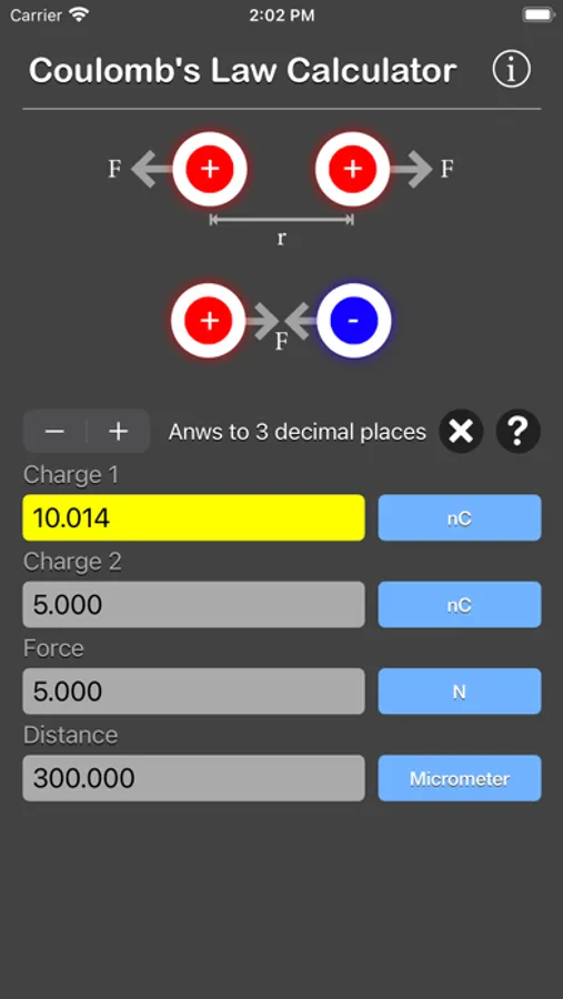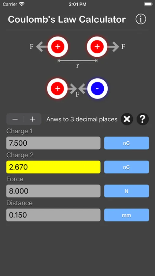 Coulomb's Law Calculator are physic/math calculator to find particle charge 1, particle charge 2, distance between particle or electrostatic force between two charged particles fast and easy.