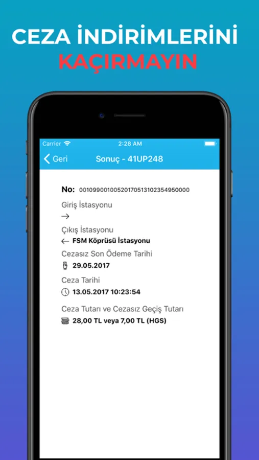 Karayollarında olan HGS, OGS, Avrasya ve Köprü geçişlerindeki cezalarınızı sorgulayabilir ve indirimlerinizi görüntüleyebilirsiniz. Sistem direk olarak karayollarından veriyi almakta ve olduğu gibi göstermekte.