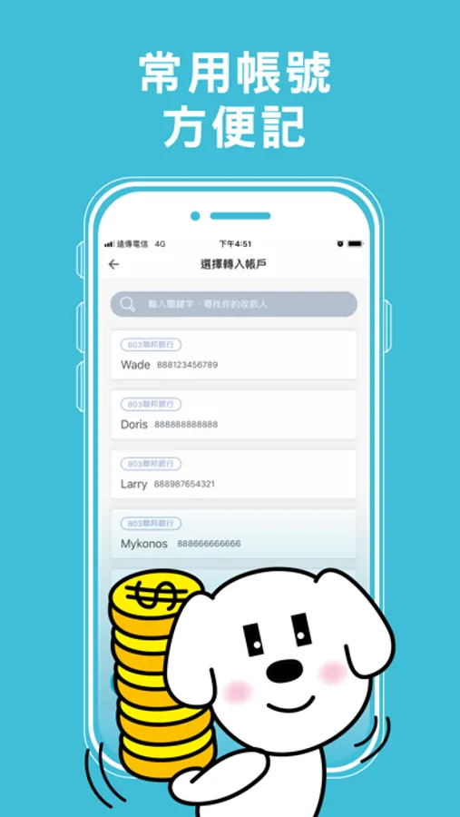簡單、便利、快速、安全,全新數位化金融服務體驗,餘額查詢、交易明細、快速轉帳通通手機一手搞定,隨時隨地滿足便捷帳務服務。