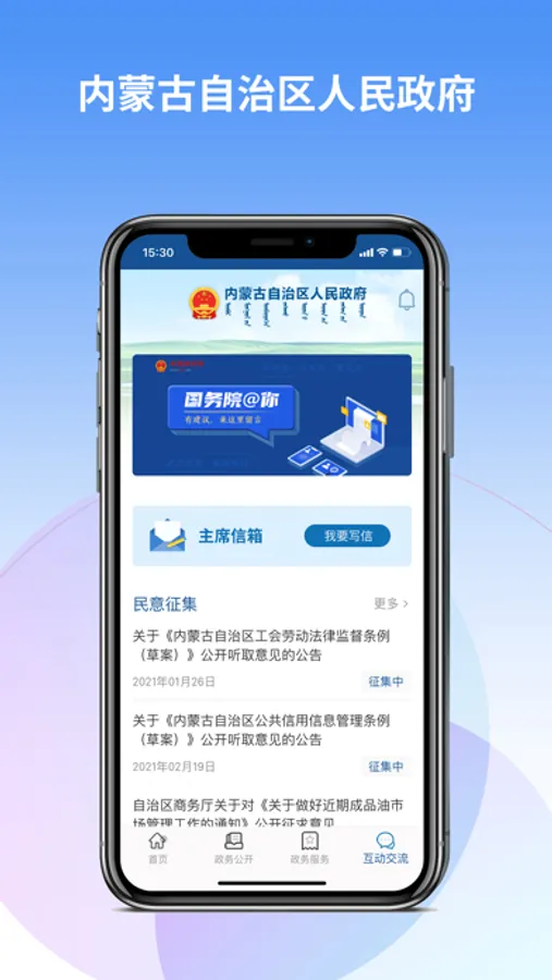 内蒙古自治区人民政府客户端提供了便捷的服务信息,及时的新闻动态,最新的政策信息,第一时间权威发布内蒙古自治区人民政府领导同志重要会议、考察、调研活动等政务信息,同时面向社会提供与政府业务相关的服务,建设基于新媒体的政府与公众互动交流新渠道。