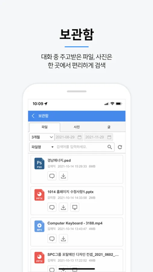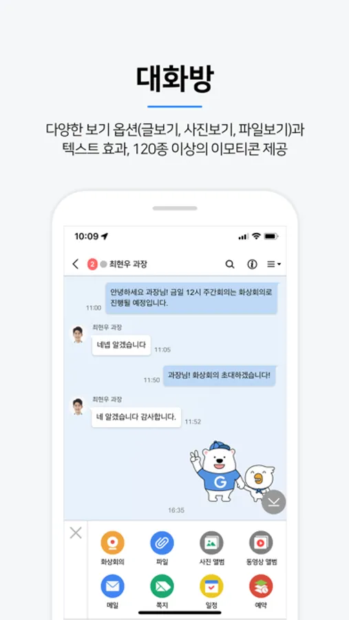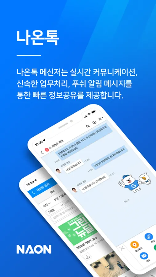 없는 실시간 커뮤니케이션, 신속한 업무처리, 푸쉬 알림 메시지를 통한 빠른 정보공유를 제공합니다.