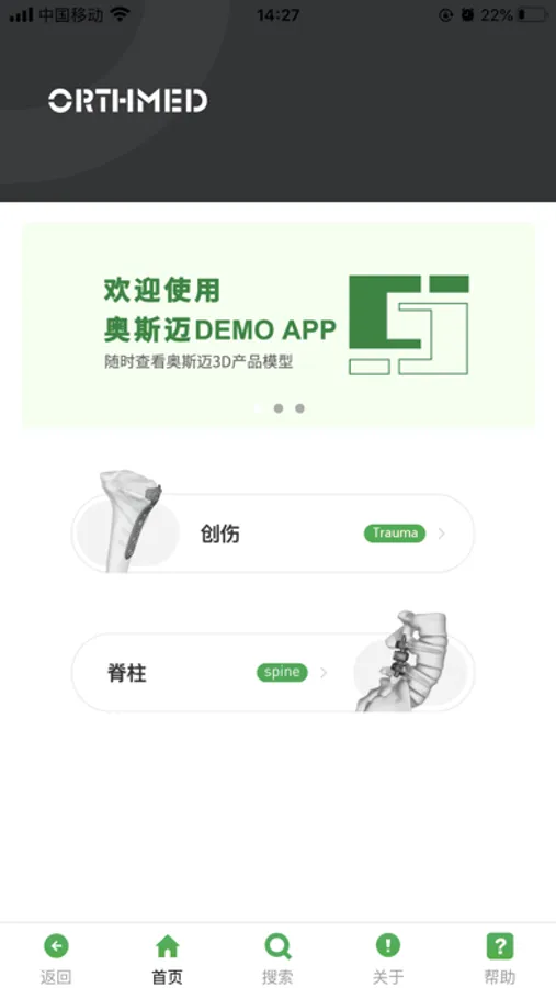 应用介绍:您将获得一个近距离全方位查看奥斯迈公司创伤和脊柱所有产品的机会,并且清晰的知晓奥斯迈公司产品在人体骨架上所涉及的部位。 支持您自由操作公司产品和骨骼的3D模型:切换预设视角,显示或隐藏产品或骨骼,全方位旋转放大缩小。