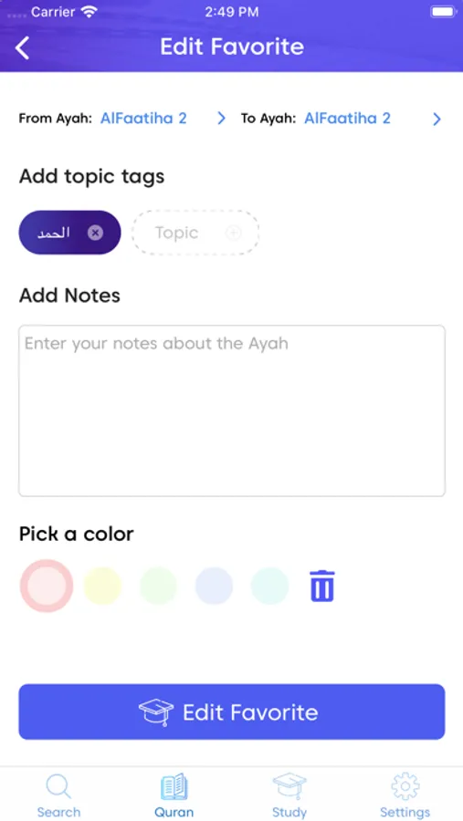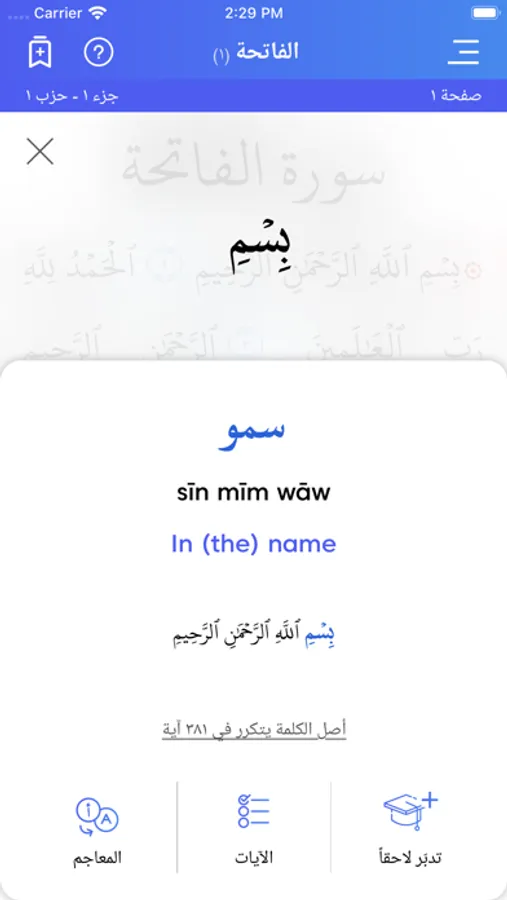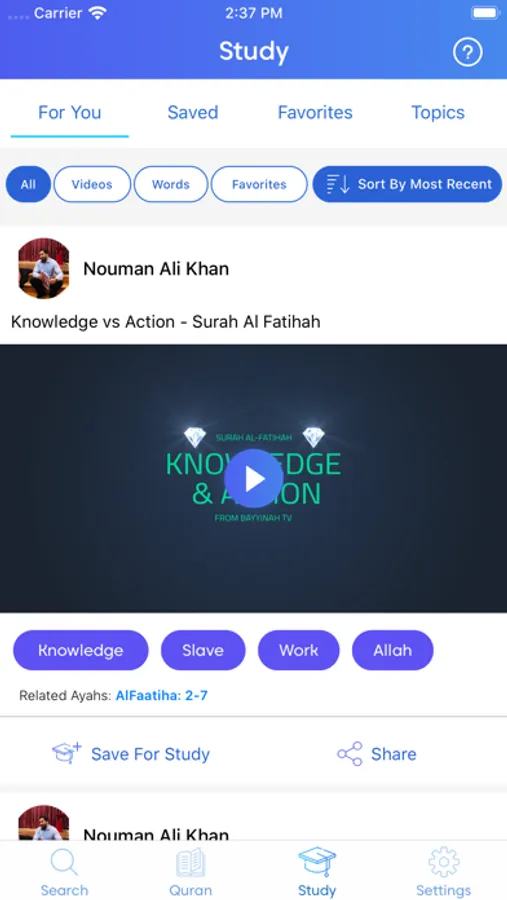 Then dig deeper to understand the meaning: Tap any word to see all ayas that use it or find its meaning in dictionaries. Tap any aya number to get different perspectives from 25+ tafsirs and many videos. When you find ayas that you want to remember, save them to your favorites and organize them using Topic tags.