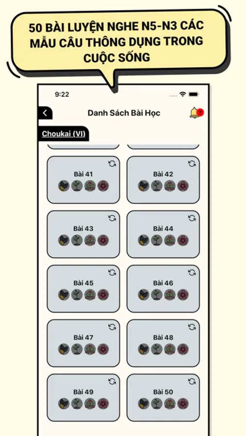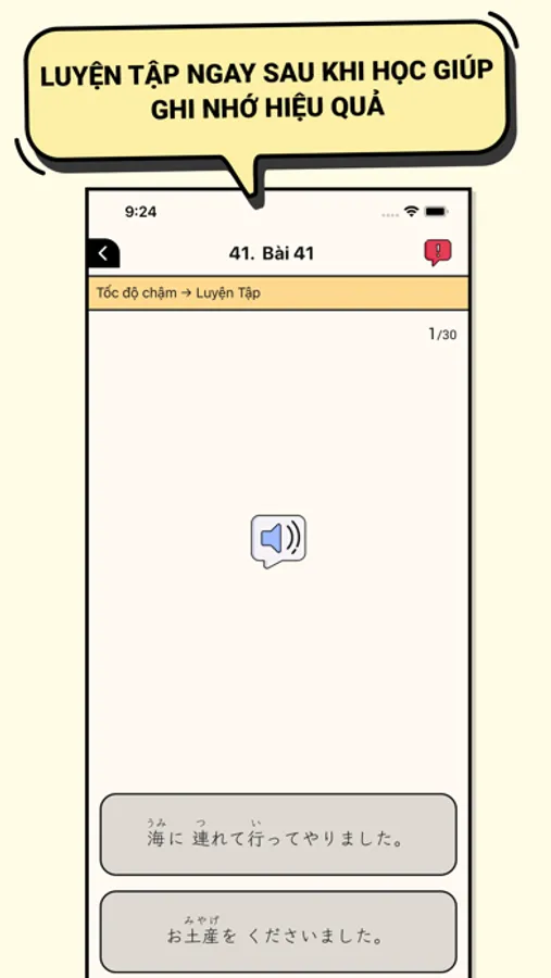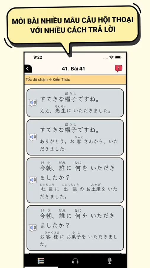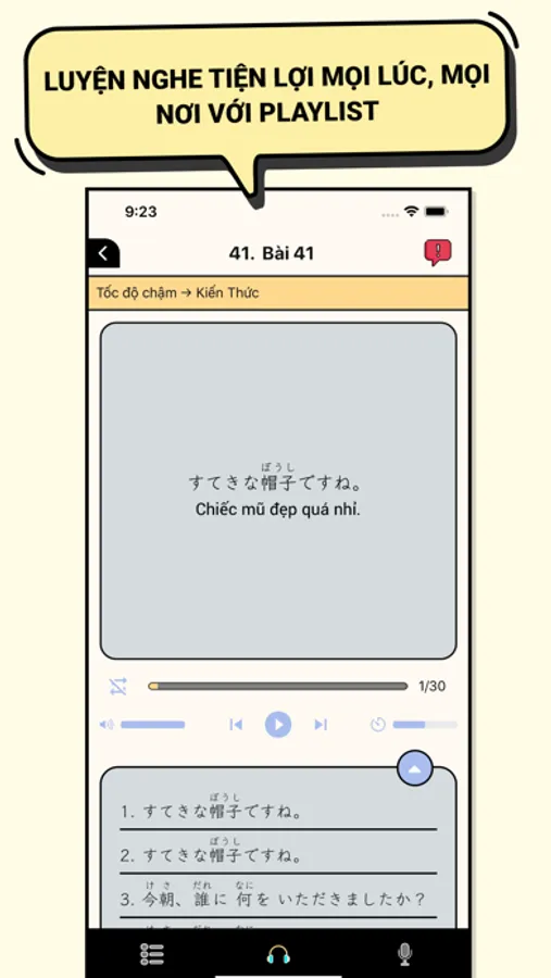 Với tính năng player bạn có thể nghe đi nghe lại(kikitori) từ vựng, câu ngắn của mỗi bài. Bạn có thể vừa nấu ăn, vừa đi tàu điện cũng vẫn có thể học được tiếng Nhật.